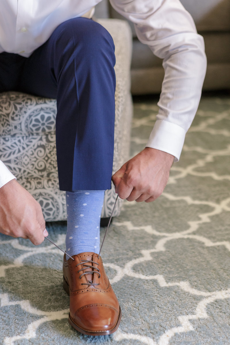 Kaleigh and her assistant arrive at the groom's getting ready location. Kaleigh photographs all of the groom's details (jacket, tie, cuff links, shoes, etc.) while her assistant photographs the guys hanging out and getting ready.